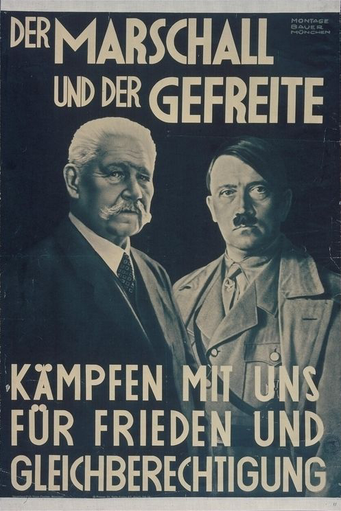 And where do the swine come from? In the 20th century? Gosh, in the age of democracy, why would one find a sudden effusion of swine in government? A famous Hitler campaign poster showed him with Hindenburg, “the Field Marshal and the Corporal.” Traditionally, of course, any such fraternization would be a military offense.